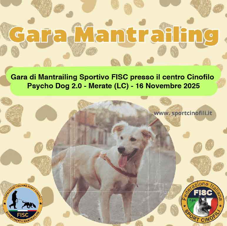 Gara di Mantrailing Sportivo FISC del 16 Novembre 2025 presso il Centro cinofilo Asd Psycho Dog 2.0 – Merate (LC) Domenica 16 novembre presso l’Associazione Psycho Dog 2.0″ di Merate si è svolta una gara speciale di mantrailing: la semifinale a staffetta delle prime 5 associazione del Nord Italia. Presenti a […]