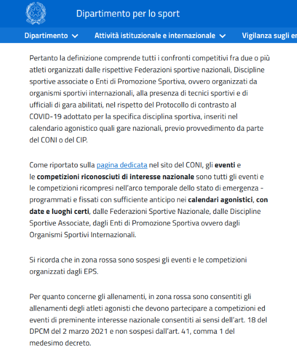 ” […] Per quanto concerne gli allenamenti, in zona rossa sono consentiti gli allenamenti degli atleti agonisti che devono partecipare a competizioni ed eventi di preminente interesse nazionale consentiti ai sensi dell’art. 18 del DPCM del 2 marzo 2021 e non sospesi dall’art. 41, comma 1 del medesimo decreto […]”.