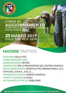Continuano le iscrizioni al Corso di Aggiornamento per Istruttori, Educatori e Responsabili Centri Cinofili FISC che si terrà il 25 Marzo presso la Sede FISC in Via Caravaggio, 44 – 20092 Cinisello Balsamo (MI).