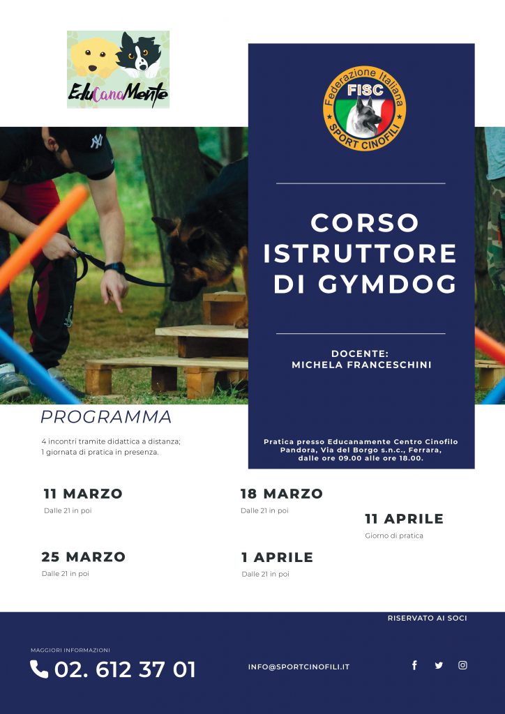Sono aperte le iscrizioni al Corso di Istruttore Gym Dog che si terrà in N° 4 incontri tramite didattica a distanza e N° 1 giornata di pratica in presenza.