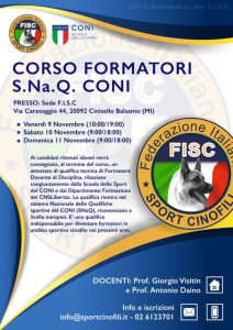 Sono aperte le iscrizioni al Corso Formatori SNaQ – Scuola dello Sport del CONI che si terrà il 9, il 10 e l’11 Novembre 2018 presso la sede FISC in Via Caravaggio 44 a Cinisello Balsamo.