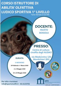 Sono aperte le iscrizioni al corso istruttore Abilità Olfattiva Ludico – Sportiva 1° livello presso il centro cinofilo Centro di Cultura Cinofila degli Audaci a Montichiari.