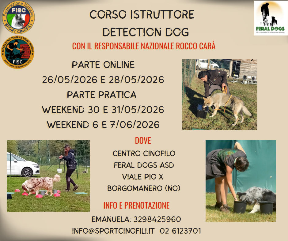 Corso Istruttore Detection Dog Sportivo del 26 Maggio 2026 presso il centro Cinofilo Feral Dogs ASD – Borgomanero (NO)