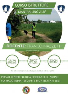 Sono aperte le iscriioni al Corso Istruttore Mantrailing 2° Livello che si terrà presso CENTRO DI CULTURA CINOFILA DEGLI AUDACI Via della Madonnina 126 – Montichiari (BS) – 25018.