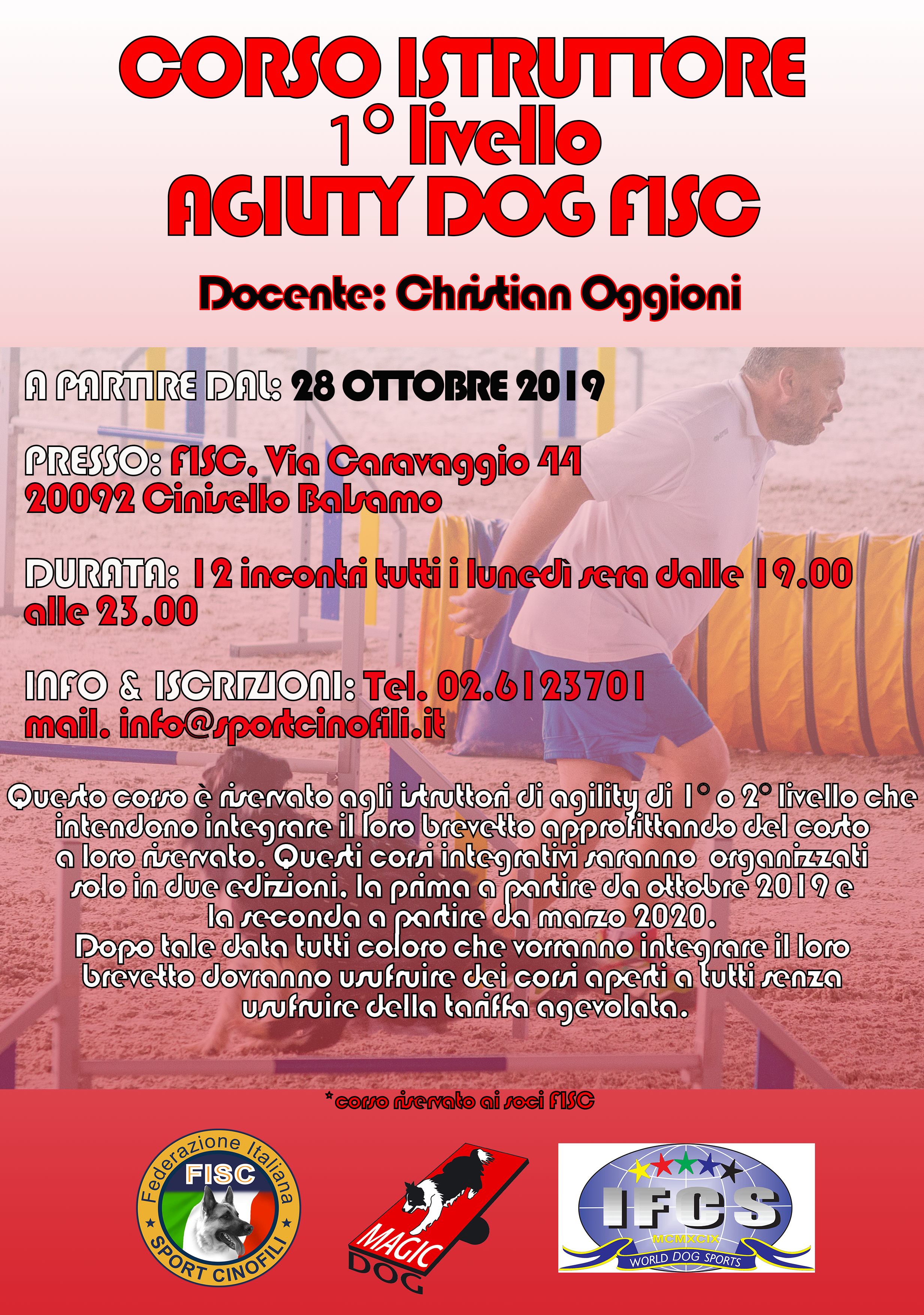 E’ in partenza il Corso Istruttori di Agility 1° livello con Christian Oggioni. Il corso durerà 12 serate dalle ore 19.00 alle 23.00 al lunedì sera a partire dal 28/10. Il corso si svolgerà presso la Sede FISC – Via Caravaggio 44, Cinisello Balsamo.
