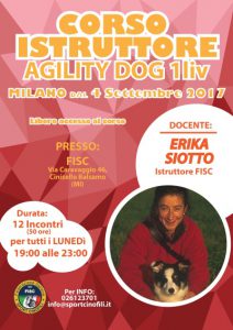 Continuano le iscrizioni al corso istruttori di Agility 1° livello con Erika Siotto che si svolgerà presso la sede FISC a Cinisello Balsamo – Via Caravaggio 44. Le lezioni si terranno tutti i lunedì sera dalle ore 19 alle ore 23. Il corso inizierà il 4 settembre 2017. Gli istruttori che hanno già il brevetto di 1°livello potranno ottenere il brevetto di 2° livello. Gli istruttori di 2° livello potranno ottenere il brevetto di 3° livello.
