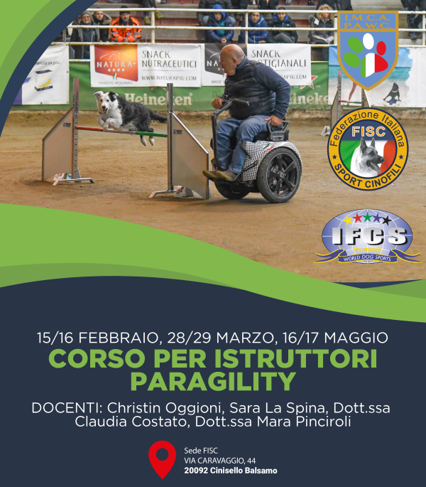 Sono aperte le iscrizioni al Corso Istruttori Paragility, il corso è rivolto a tutti gli istruttori di Agility FISC di 3° livello e a tutti gli istruttori di agility con comprovata esperienza da documentare tramite CV cinofilo a info@sportcinofili.it. Il corso si svolgerà presso la FISC sita in Via Caravaggio 44, 20092 Cinisello Balsamo (MI).