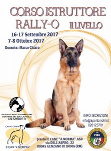 Il corso si svolgerà presso il centro cinofilo Il Cane a Norma ASD nei seguenti weekend: 16-17 Settembre e 7-8 Ottobre 2017 per un totale di 32 ore come previsto dal regolamento di formazione istruttori. Le materie trattate durante il corso sono: approfondimento degli esercizi più complessi, preparazione allenamenti, preparazione percorsi, ordinamento sportivo. Gli esami finali si svolgeranno nell’ultimo weekend del corso e sono suddivisi in prova teorica scritta e pratica.