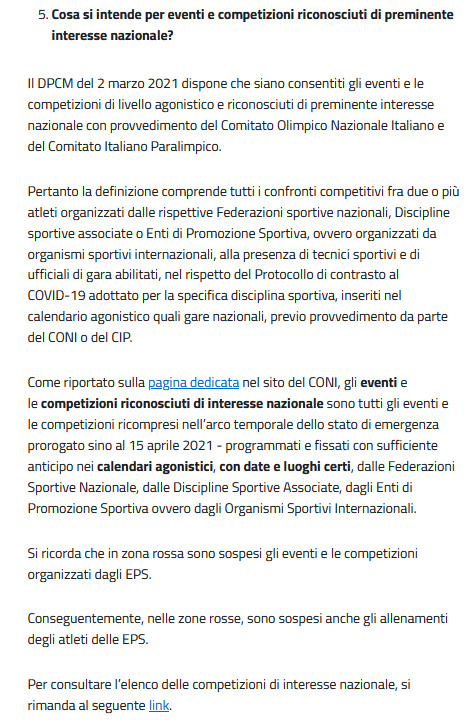 Il DPCM del 2 marzo 2021 dispone che siano consentiti gli eventi e le competizioni di livello agonistico e riconosciuti di preminente interesse nazionale con provvedimento del Comitato Olimpico Nazionale Italiano e del Comitato Italiano Paralimpico.
