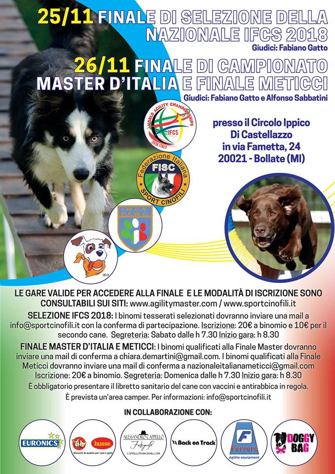 Sono ufficialmente online le liste dei binomi ammessi alle Finale di campionato FISC & Finale di selezione della nazionale IFCS 2018. La finale di campionato FISC si svolgerà sabato 25 novembre presso il Circolo Ippico di Castellazzo a Bollate (MI), nella stessa location si svolgerà, ad Aprile, il Campionato del Mondo di Agility IFCS. La finale sarà giudicata da Fabiano Gatto e Filippo Pettinao. Sarà presente il selezionatore della nuova nazionale Alfonso Sabbatini.