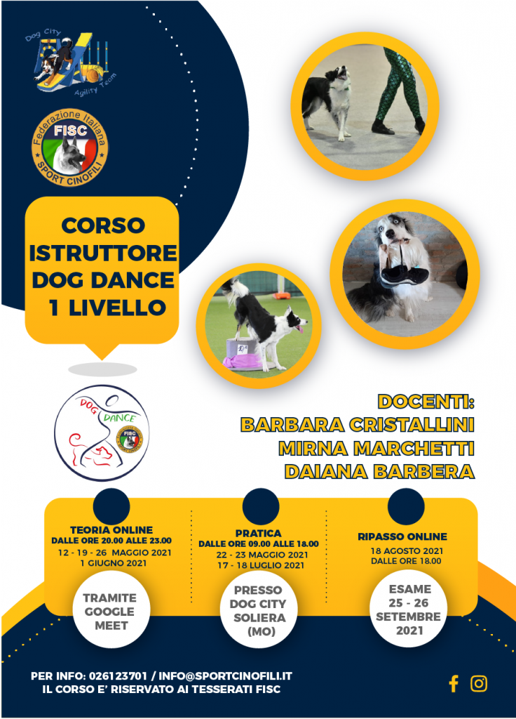 Vi presentiamo i prossimi tre appuntamenti della Dog Dance FISC:Corso Istruttore Dog Dance 1 ° Livello che si svolgerà nelle seguenti modalità: