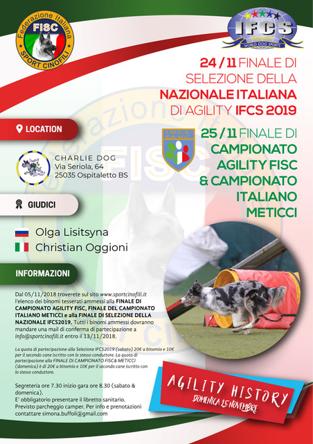La gara di domenica è la FINALE DEL CAMPIONATO DI AGILITY FISC E FINALE DEL CAMPIONATO ITALIANO METICCI 2018. La gara è aperta a Junior e Senior e decreterà il Campione Italiano di Agility FISC 2018. Il vincitore del Campionato FISC 2018 senior entrerà in nazionale IFCS2019.