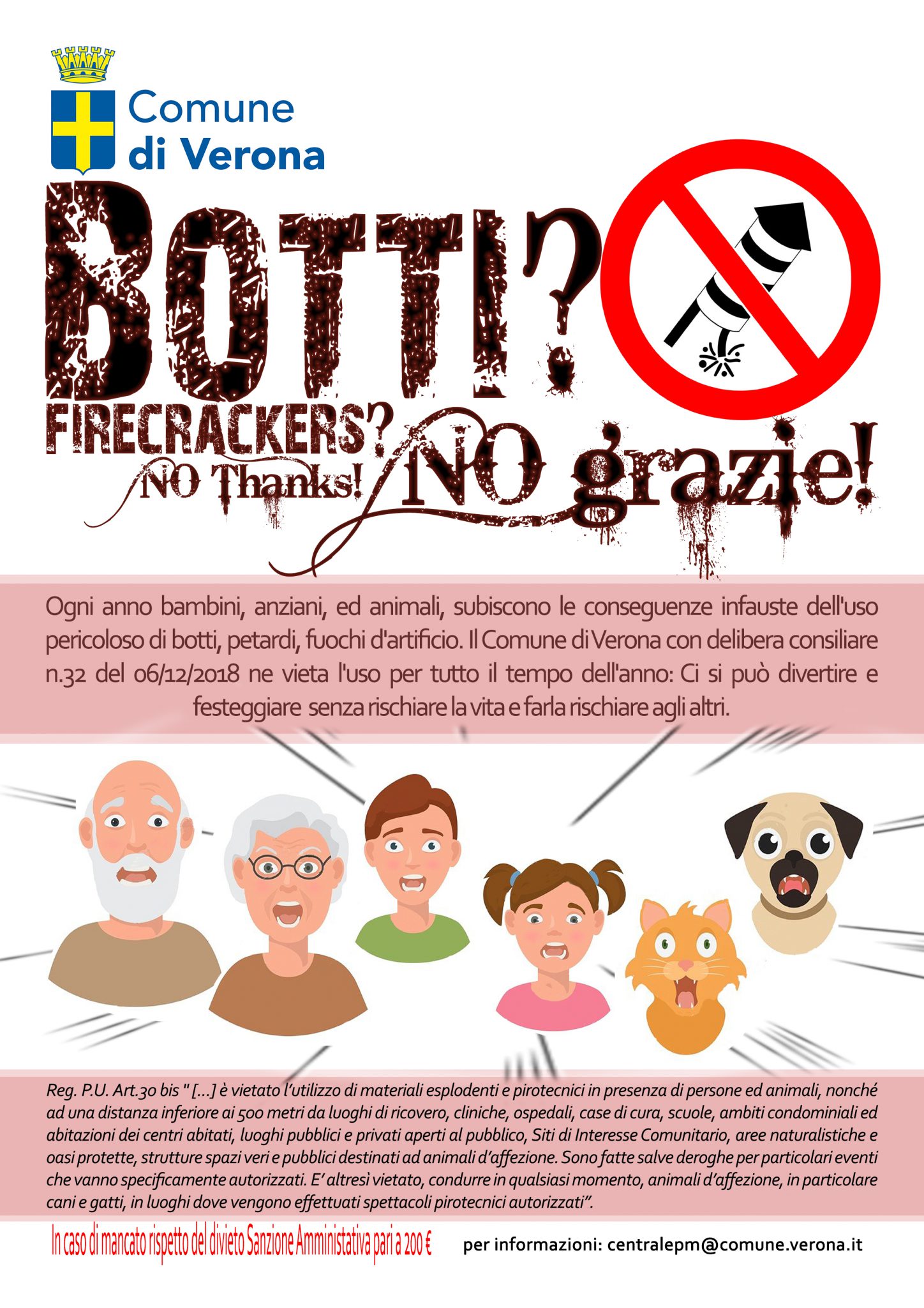 Quest’anno il Comune di Verona ha votato favorevolmente una delibera consiliare proposta dalla Dott.ssa Laura Bocchi, Consigliere Delegato alla Tutela e Benessere degli Animali e Presidente Commissione Consiliare Affari Animali del Comune di Verona in data 6/12/2018. Questa delibera “Rende le limitazioni dell’utilizzo di botti valevoli sempre, 365gg l’anno, e non limitatamente ad un periodo, così come impone lo strumento ordinanza.” Dice la Dott.ssa Laura Bocchi.