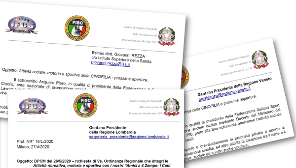 - il 27 aprile il Presidente FISC in mattinata ha contattato tramite mail diretta tutti i Presidenti delle Regioni al fine di sollecitare l’emissione di un’Ordinanza Regionale che integri le Attività ricreative, motorie e sportive con i nostri amici a 4 zampe.