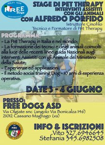 Il 3 e il 4 Giugno 2017 presso il Centro Cinofilo Free Dogs in Via Olgiate SNC (angolo via Bonicalza n°. 146) – 21012- Cassano Magnago (VA) si svolgerà uno stage di Pet Therapy con Alfredo Porfido, istruttore e tecnico-formatore di Pet Therapy.