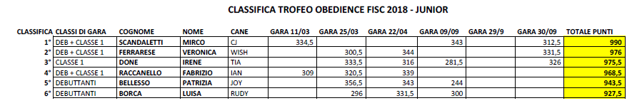Il Campionato Obedience FISC 2018 si è oramai concluso. Quest’anno il circuito gare ha permesso ai binomi partecipanti di guadagnare punti validi per entrare nella classifica del Trofeo di Obedience che ha premiato i binomi delle classi debuttanti e classe 1 che quest’anno hanno partecipato ad almeno 3 gare.